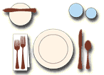 อุปรกร์ตักอาหาร : ช้อน , ส้อม , ส้อมสำหรับตักสลัด , มีดตัดอาหาร , มีดตัดขนม (วางบนจานขนม)